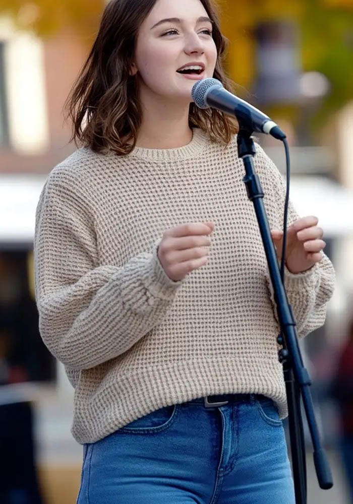 „Mulțumesc,” a răspuns ea, zâmbind. „A fost o întâmplare să cânt. Am auzit trupa și m-am alăturat.”