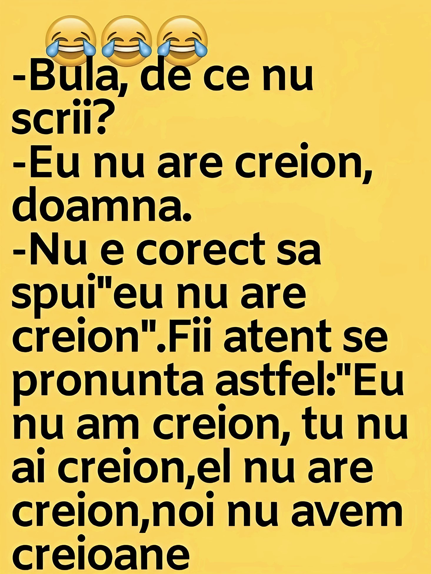 Bula, de ce nu scrii-Bula, de ce nu scrii?-Eu nu are creion, doamna.