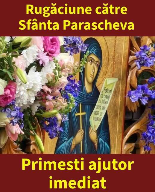 „Purtătoare de chinuri, Sfântă Parascheva, roagă-te Parintelui Ceresc pentru mine, cel împovărat cu păcate. Ridică-mă spre cuvântarea măririi Sale și îndreaptă-mă ca întotdeauna să am sus inima, să gândesc la cele cerești. Cheamă și pe Duhul Sfânt să-mi zidească inimă curată și duh drept să înnoiască întru cele dinlăuntru ale mele, ca să mă întărească în lucrarea faptelor bune. Cred că toate acestea mi le poți mijloci, o, Sfântă Parascheva, căci ai preamărit pe Dumnezeu cu faptele tale. Amin!”
