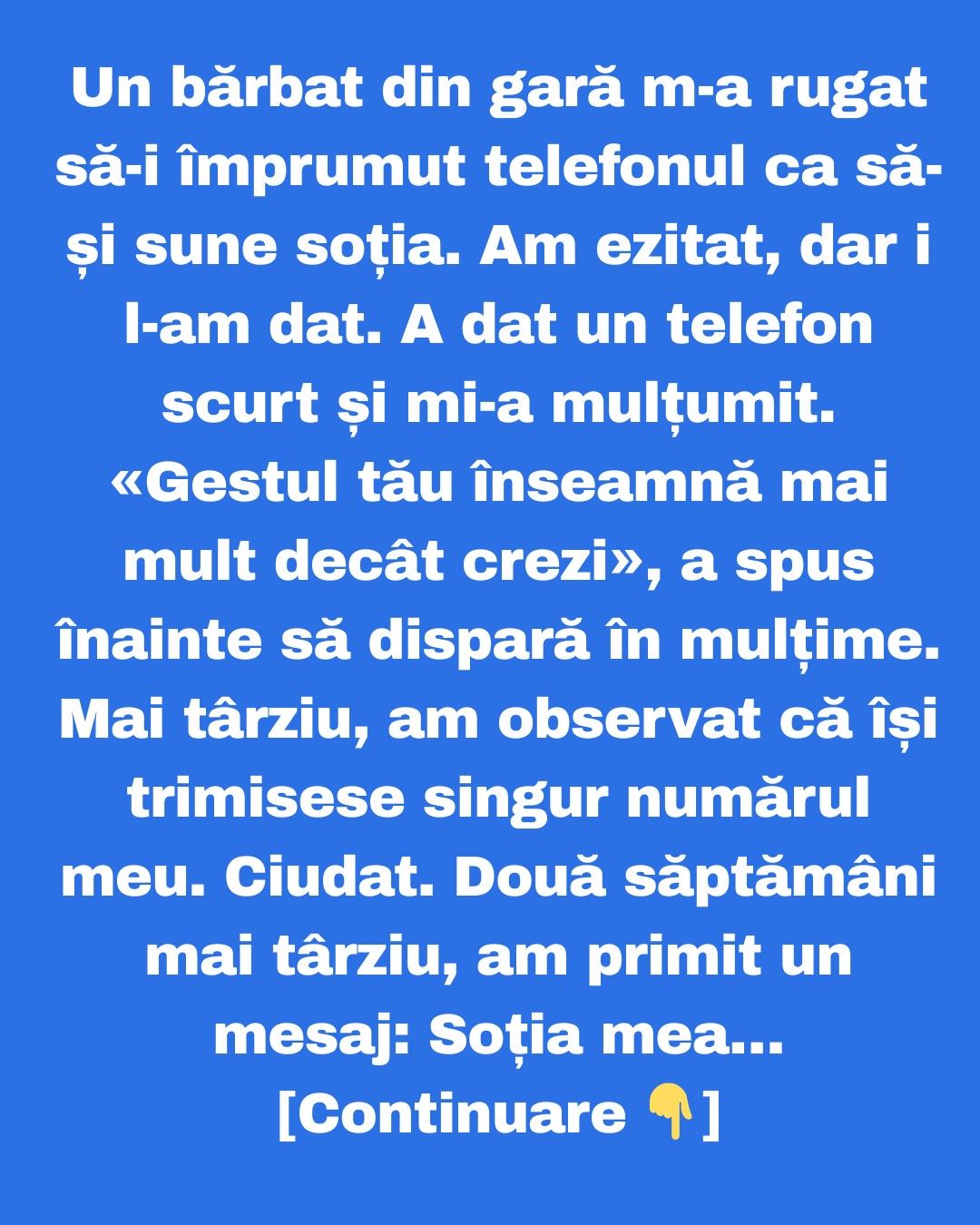 Bărbatul din gară m-a sunat. Vocea îi era încărcată de emoție. Mi-a spus că i-am salvat viața și că, fără acel telefon împrumutat, ar fi fost acuzat pe nedrept. Am vrut să-l întreb de ce se apropiase atunci de mine, dar el a adăugat înainte să apuc să vorbesc că fusese o alegere întâmplătoare și că eram singura persoană care îl privise în ochi.