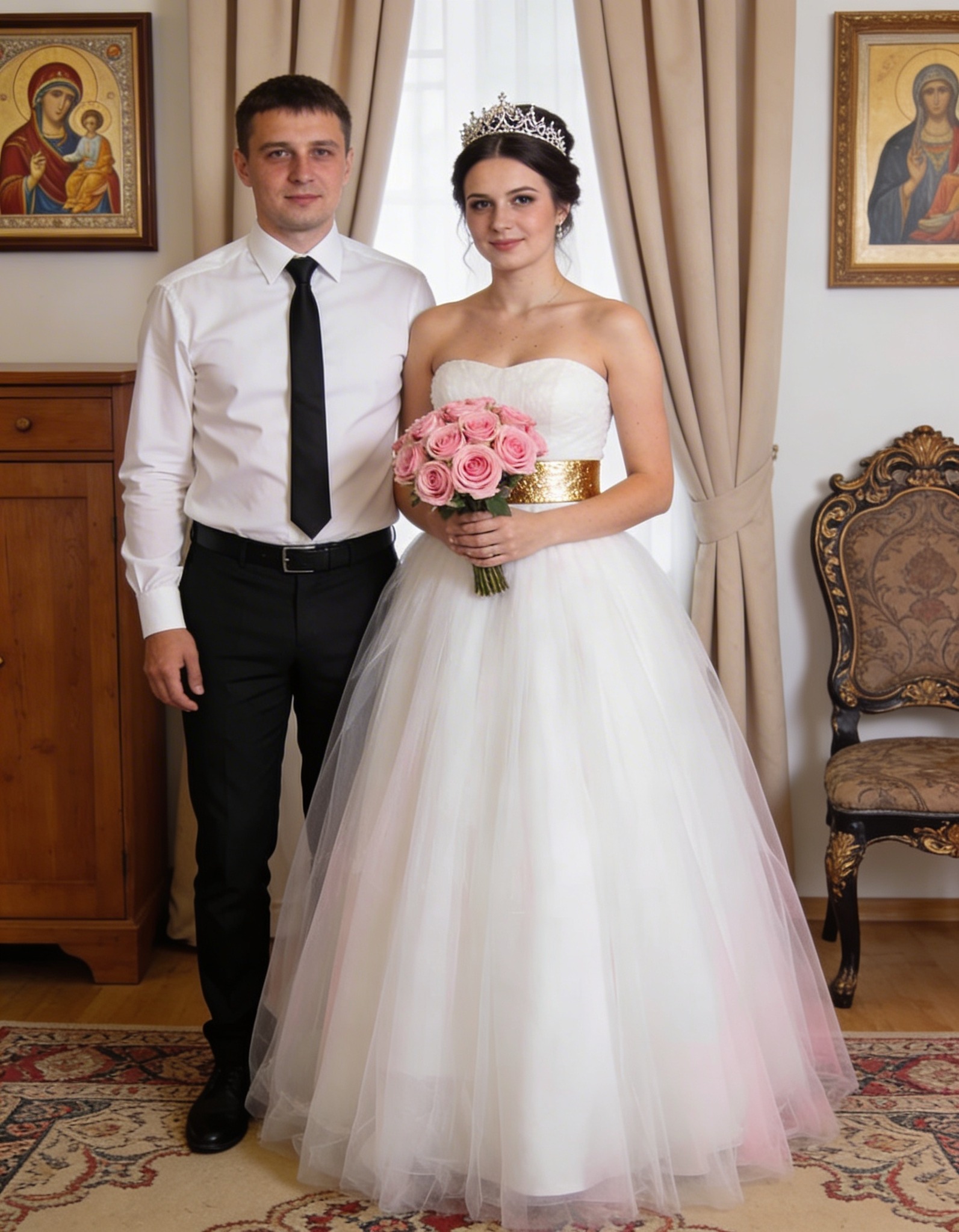 Afară, clopotele bisericii din apropiere au început să bată. Soarele pătrundea prin ferestrele mari ale salonului, luminând rochia, lacrimile și zâmbetele.