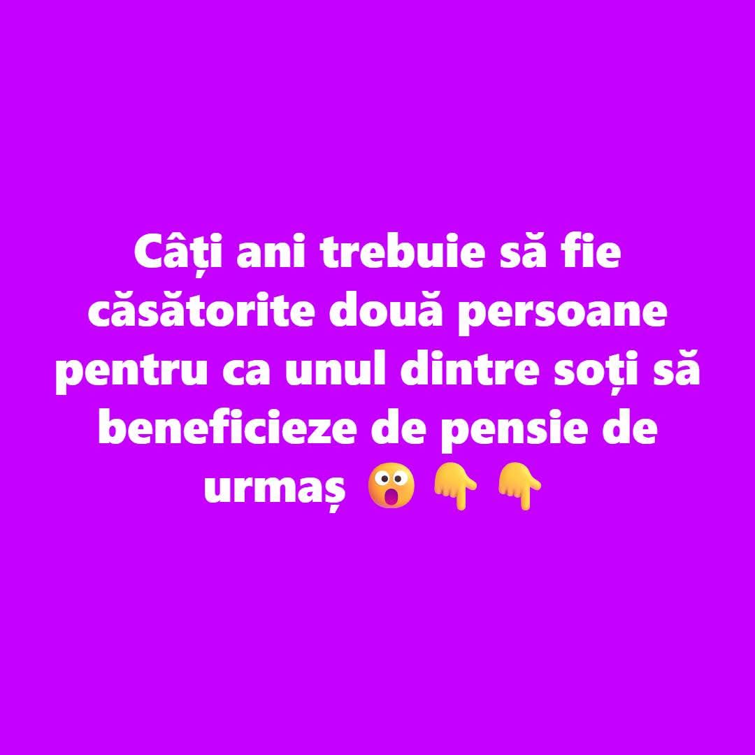Durata casatoriei necesara:Pentru a beneficia de pensie de urmas, cuplul trebuie sa fi fost casatorit cel putin 15 ani.