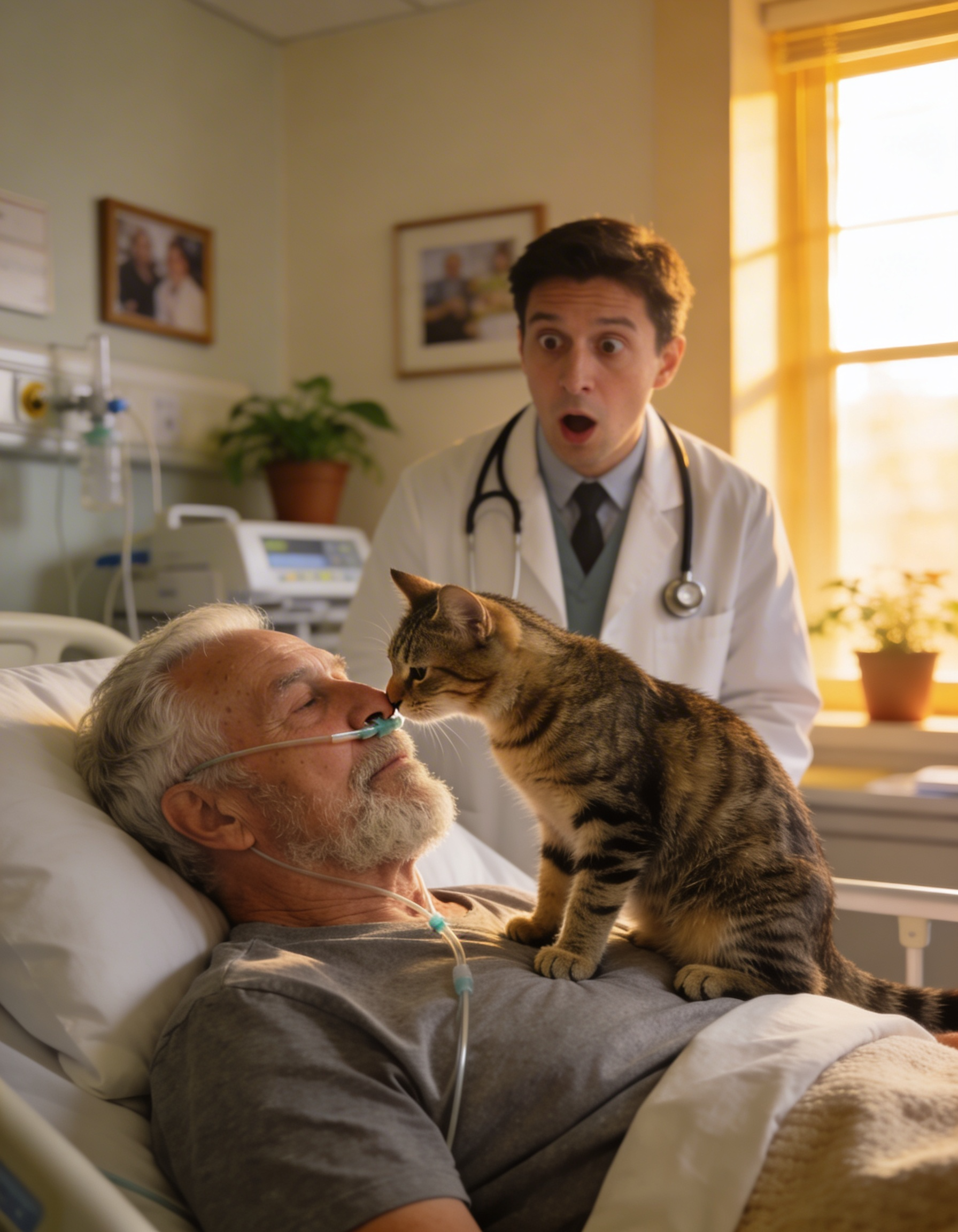 Motanul, micul motan slab, sări jos de pe pat și se așeză la picioarele lor, ca și cum treaba lui se terminase. Își lingea blănița cu nonșalanță, de parcă trezirea unui om din comă era doar o zi obișnuită pentru el.