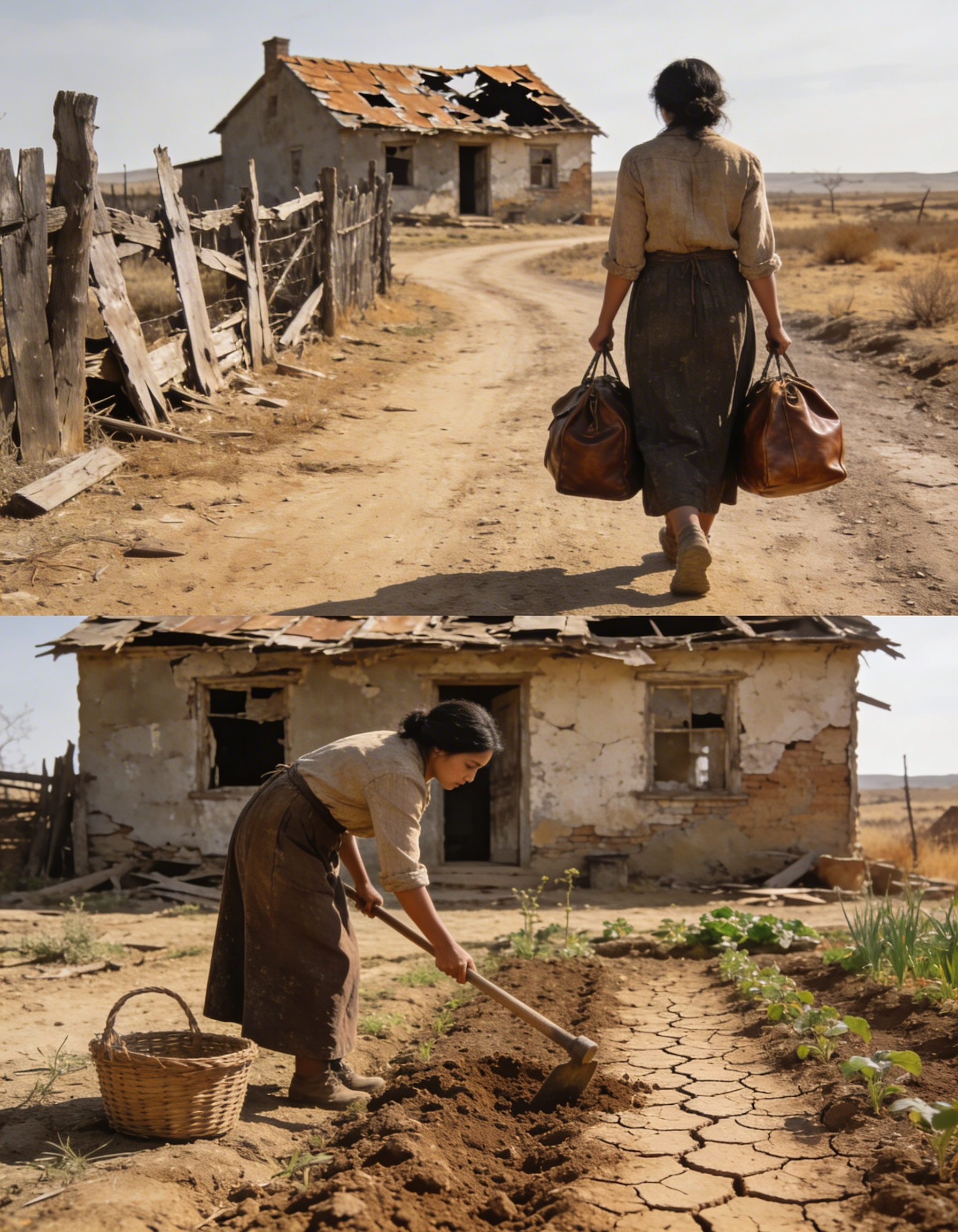 Pământ crăpat. Buruieni uscate până la genunchi. Câțiva pomi bătrâni, strâmbi, de parcă și ei voiau să plece de acolo. Nicio fântână. Nici gard.